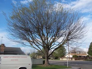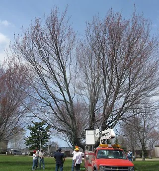 The tree forks into two codominant stems about five feet from the ground. The entire tree needs to be reduced to help prevent the tree from splitting apart. Only the left side of the crown was reduced in the right photograph. The right side of the crown also needs to be reduced.