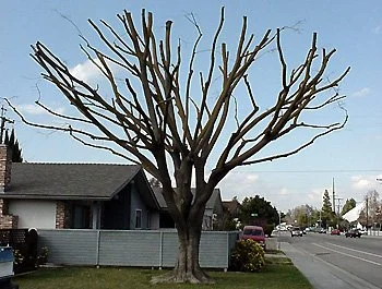 The objective is to make reduction cuts so lateral branch tips remain intact on the outer edge of the new, smaller crown (right photograph). Ideally, pruning cuts should be hidden and the crown periphery should look a bit jagged.