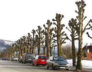 Examples of pollarding which maintains trees at the same height forever. New shoots are removed back to the same point, the pollard head, annually. Trees in the photograph are 140 years old.